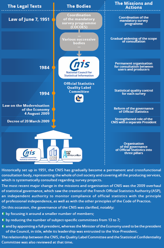 Although the organisation of the CNIS, in terms of its general principle and structures, has changed relatively little over the last few decades, this stability is not synonymous with immobility. Historically, the CNIS has always kept pace with changes to its environment, whether in terms of uses or the general framework for the production of official statistics (Box 2).