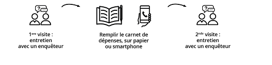 Entre les deux visites de l’enquêteur, vous serez invité à noter toutes vos dépenses dans un carnet pendant une semaine. Vous pourrez utiliser votre téléphone, avec une application smartphone pour noter vos dépenses facilement. Par ailleurs, vous pourrez répondre à une partie du questionnaire sur internet. Le second entretien avec l’enquêteur sera ainsi plus court.