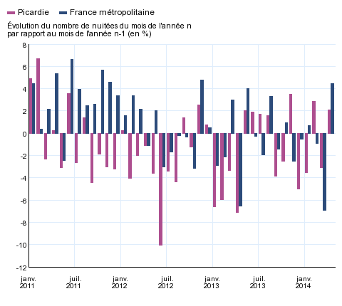 Le volume de nuitées françaises est par contre en diminution en Picardie (-2,1 %) comme sur l’ensemble du territoire (-2,9 %).