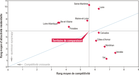 Afin d’étudier la compétitivité, on retient dix départements cibles pour constituer un territoire de comparaison incluant également le Finistère : le Calvados, les Côtes-d’Armor, l’Ille-et-Vilaine, la Loire, la Loire-Atlantique, le Maine-et-Loire, le Morbihan, la Seine-Maritime, le Var et la Vendée. Certains sont voisins du Finistère. D’autres abritent un pôle urbain principal d’une taille proche de celle de Brest. D’autres, enfin, affichent des traits communs avec le tissu économique finistérien.