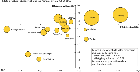 Ainsi, en Lorraine, le taux de création d’emploi attendu devrait être de 12,4 %. Le taux de création réel n’étant "que" de 11,2 %, la Lorraine présente un effet géographique négatif de - 1,2 %.
