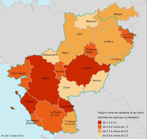 À l’inverse, les zones d’emploi du Mans, Laval, Alençon, Fontenay-le-Comte, La Flèche et Segré, avec moins de résidents diplômés du supérieur ou étudiants que de natifs, ne parviennent ni à retenir ou à faire revenir leurs diplômés ou étudiants natifs, ni à en attirer beaucoup. Les zones d’emploi de Cholet, Saumur, Mayenne et Châteaubriant ont nettement moins de diplômés du supérieur ou d’étudiants qui résident sur leur territoire que de natifs. Les natifs de ces zones rurales, avec une offre de formations supérieures moins diversifiée et un marché du travail offrant moins de possibilités d’insertion, vont poursuivre leurs études ou chercher une insertion professionnelle ailleurs.