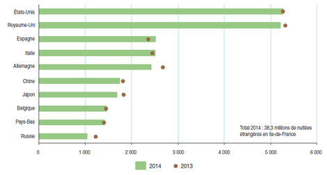 graphiqueFigure_5 – Plus de 10 millions de nuitées pour les touristes britanniques et américains en Ile-de-France (Top 10 des principales clientèles étrangères séjournant en Ile-de-France en 2013 et 2014 (en milliers de nuitées))