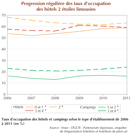 La saison touristique limousine de mai à septembre 2011 s'avère très positive pour les campings. Afflux important de campeurs français, séjours plus longs, et attrait accru pour le haut de gamme et le locatif permettent aux campings limousins d'afficher une hausse de fréquentation pour la troisième année consécutive. Malgré une météo plutôt défavorable, leur fréquentation atteint ainsi un niveau proche des excellentes saisons 2005 et 2006. Dans l'hôtellerie, la situation est moins favorable : l'essor du haut de gamme est moins marqué qu'au niveau national et l'offre hôtelière de la région est globalement en repli.