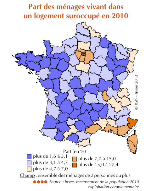 En Limousin, 3,0 % des logements sont suroccupés. Ces conditions difficiles concernent plus de 6 600 ménages limousins, soit 24 750 personnes. En 2010, on comptabilise ainsi près de 1 600 logements suroccupés de moins qu'en 1999 alors que le parc potentiellement concerné a progressé de 10 000 logements.