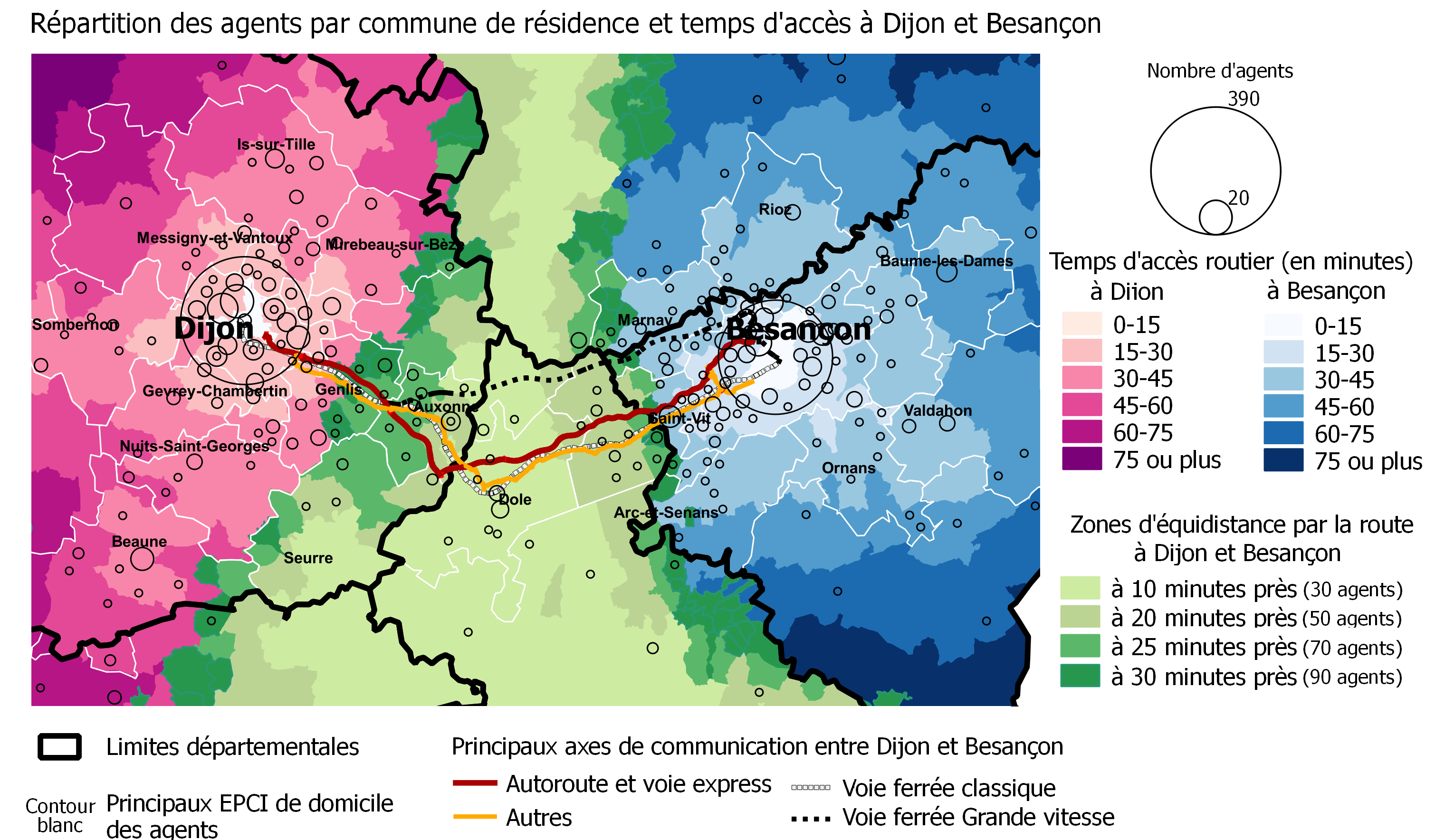 En Bourgogne et en Franche-Comté, les agents de ces administrations habitent pour la plupart soit à Dijon ou à Besançon, où se trouve leur résidence administrative, soit dans des communes proches : les deux tiers, 730, sont domiciliés dans le Grand Dijon et le Grand Besançon. Parmi ceux-ci, 283 vivent et travaillent à Dijon, 226 vivent et travaillent à Besançon. Par ailleurs 120 fonctionnaires résident dans l‘espace englobant les communes proches des gares de Genlis, Auxonne, Dôle, Saint-Vit (réseau TER) ou proches de la gare TGV (comme par exemple Geneuille ou Rioz), qui permettent de relier facilement Dijon et Besançon. Sur ce territoire, ceux qui habitent des communes situées dans une bande médiane entre Dijon et Besançon, mettent pratiquement autant de temps par la route pour rejoindre ces deux villes : pour une trentaine, l’écart entre les durées des deux trajets n’excéde pas dix minutes. Mais en s’éloignant de cette bande, l’écart de temps augmente ; il peut ainsi atteindre la demi-heure pour une quarantaine d’agents.