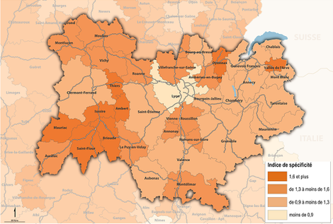 Indice de spécificité de fonctions dans un territoire : rapport entre la part de l’emploi que représentent ces fonctions dans le territoire et la part de l’emploi qu’elles représentent en France métropolitaine.