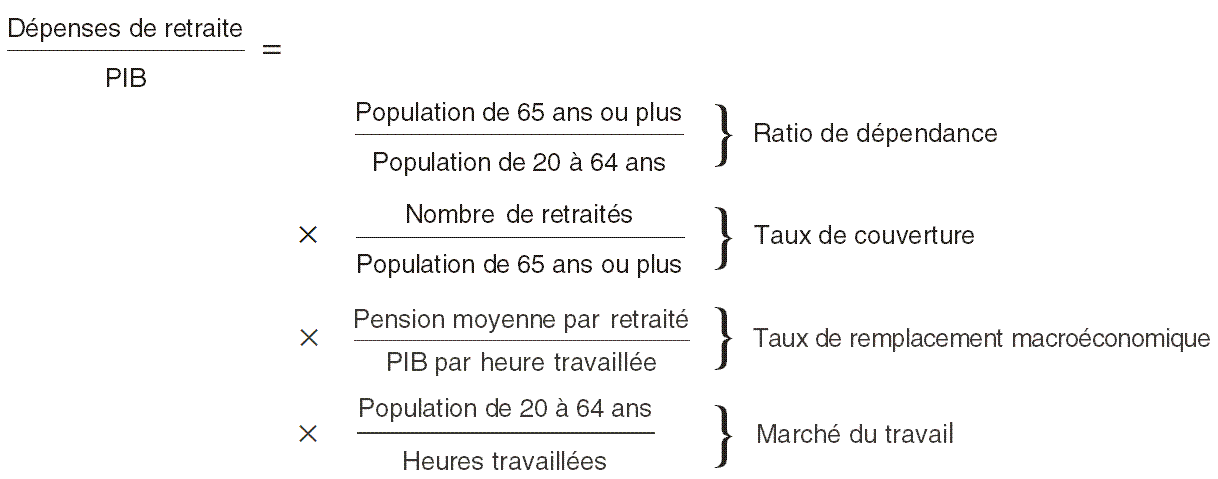 Dans le cadre de l'AWG, le ratio retraites/PIB est décomposé de manière à faire apparaître les principaux déterminants macroéconomiques de l'évolution de ce ratio :