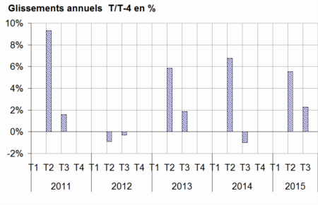 Au troisième trimestre 2015 en France métropolitaine, la fréquentation touristique dans les hébergements collectifs touristiques, exprimée en nuitées, progresse de 3,0 % par rapport à la même période de 2014 (après +2,3 % le trimestre précédent). Les hausses depuis le début d'année se confirment dans l'ensemble des hôtels, campings et autres hébergements collectifs. La fréquentation augmente surtout du fait de la clientèle française, sauf pour les hôtels.