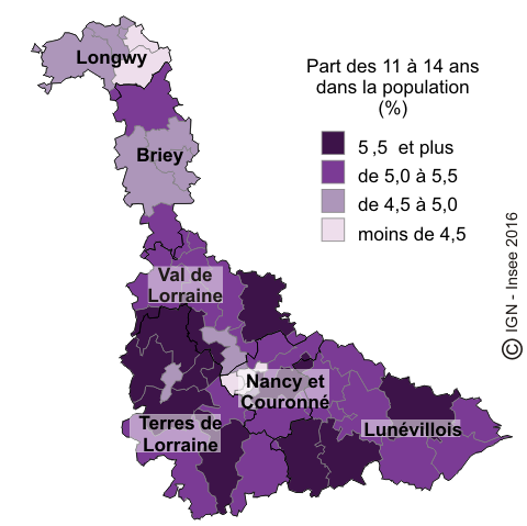 Le territoire Terres de Lorraine reste un territoire jeune. Les habitants de moins de 14 ans représentent 20 % de sa population, soit 2,5 points de plus que la moyenne du département. On recense notamment près de 5 400 enfants de 11 à 14 ans, en âge de fréquenter le collège.