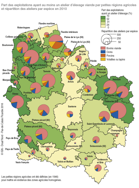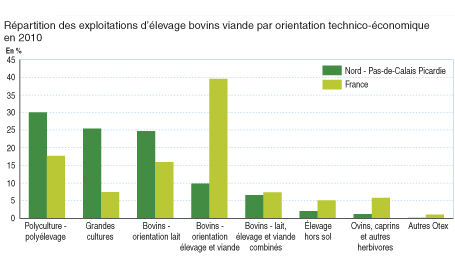 Le poids de l’élevage est historiquement plus important dans les départements du Nord et du Pas-de-Calais : il représente plus de 40 % des exploitations soit environ 10 % de plus que dans les autres départements. L’élevage viande est présent dans plus de 6 exploitations sur 10 dans la petite région de la Thiérache (partagée entre le Nord et l’Aisne) ainsi que dans le Boulonnais et le Haut Pays d’Artois à l’ouest de la région. Le Nord et le Pas-de-Calais regroupent par ailleurs 55 % des ateliers bovins viande et le taux grimpe jusqu’à 80 % pour les ateliers porcins et 70 % pour les ateliers de volailles ou lapins. Les élevages ovins sont répartis plus uniformément sur le territoire régional (taux compris entre 23 % dans l’Aisne et 17 % dans l’Oise).