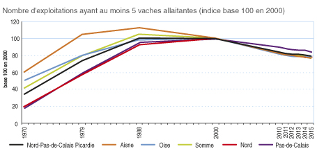 Une forte incitation à la cessation d’activité laitière et l’instauration des quotas laitiers en 1984 aboutissent à une baisse considérable du nombre d’exploitations et du cheptel laitiers. Ainsi, depuis 1970, le nombre d’exploitations laitières3 a été divisé par 8, passant de 44 900 exploitations en 1970 à 5 350 exploitations en 2015.