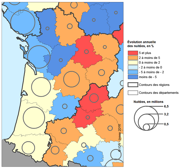 Les plus fortes hausses de fréquentation s’observent dans les départements de l'intérieur : + 10,0 % en Haute-Vienne, + 3,5 % en Dordogne et + 3,4 % dans la Creuse (figure 2). Dans les départements côtiers, le nombre de nuitées diminue de 2,2 % en Charente-Maritime (après + 7,8 % en 2015) alors qu'il augmente dans les Pyrénées-Atlantiques (+ 1,8 %), la Gironde (+ 1,5 %) et les Landes (+ 1,2 %).