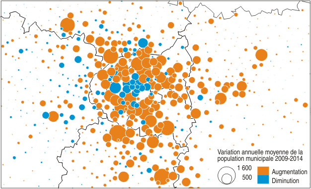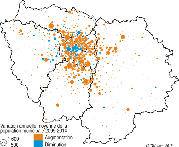 Entre 2009 et 2014, la population augmente dans les deux tiers des communes d’Ile-de-France. Les communes dont la population progresse de plus de 1 % par an sont majoritairement des petites communes situées en grande couronne. Toutefois, les gains de population les plus importants s’observent autour de Paris, ainsi que dans le nord de l’Essonne, l’ouest de la Seine-et-Marne et le sud du Val-d’Oise. Paris perd des habitants au profit de sa petite couronne, tandis que la périurbanisation est toujours à l’œuvre de la petite couronne vers la grande couronne.