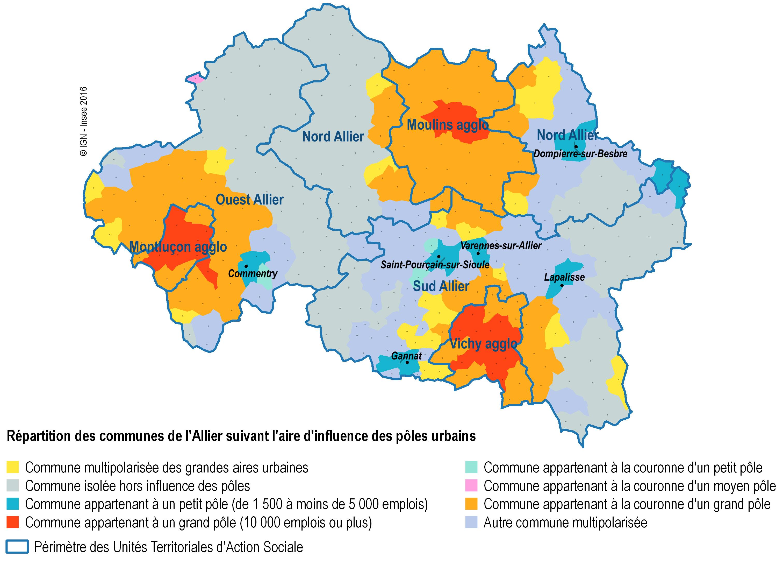 Les pôles urbains sont les unités urbaines offrant plus de 1 500 emplois. Au sein de ces pôles, on distingue les grands pôles urbains comptabilisant plus de 10 000 emplois (Montluçon, Moulins et Vichy), les moyens pôles (5 000 à 10 000 emplois), et les petits pôles (1 500 à 5 000 emplois).