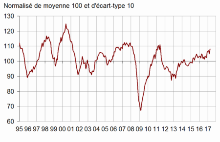 Selon les chefs d'entreprise interrogés en avril 2017, le climat conjoncturel dans l'industrie gagne trois points. Il atteint 108, son plus haut niveau depuis juin 2011, nettement au-dessus de sa moyenne de long terme (100).