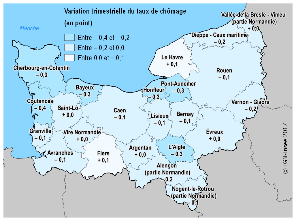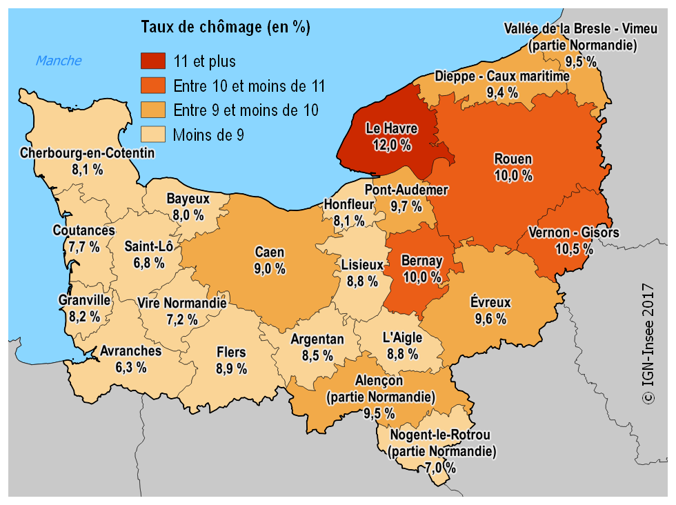 Au deuxième trimestre 2017, le taux de chômage en Normandie s’élève à 9,5 % de la population active. Il est toujours en repli par rapport au trimestre précédent, poursuivant un recul entamé un an plus tôt. Les deux tiers des zones d’emploi normandes suivent cette tendance baissière. À la mi-année, l’Eure et la Seine-Maritime restent les deux départements de Normandie les plus touchés par le chômage.