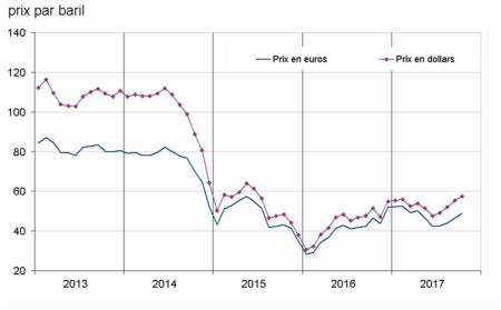 En octobre 2017, le prix en euros du baril de pétrole brut de la mer du Nord (Brent) poursuit son redressement (+5,2 % après +5,9 % en août), à 49 € en moyenne par baril. En dollars, la hausse est un peu moins marquée (+3,8 % après +6,9 %), l'euro s'étant légèrement déprécié au cours du mois.
