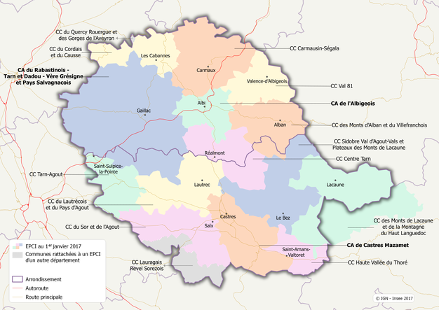 Après la mise en place de la loi du 7 août 2015, dite loi « NOTRe » (Nouvelle organisation territoriale de la République), 16 intercommunalités à fiscalité propre couvrent le département du Tarn au 1er janvier 2017, contre 21 auparavant.