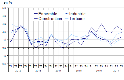 Au troisième trimestre 2017, l'indice du coût du travail (ICT) - salaires et charges de l’ensemble du secteur marchand non agricole accélère légèrement sur le trimestre (+0,4 % après +0,2 %), comme sur un an (+1,3 % après +1,1 %), en données corrigées des variations saisonnières.