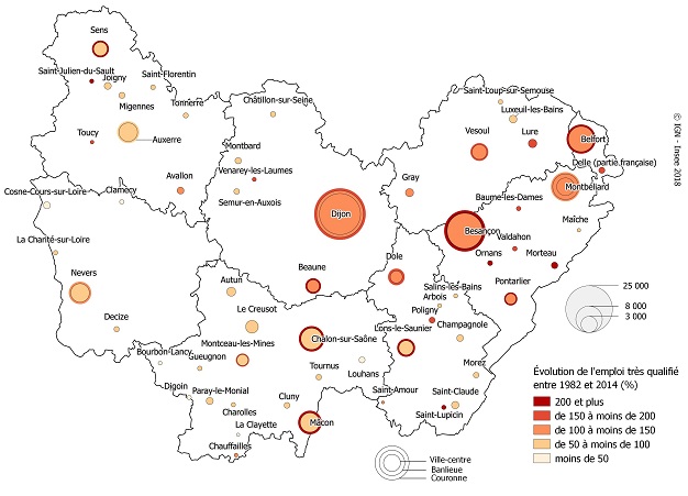 | Nombre d’emplois en Bourgogne-Franche-Comté en 2014 | Évolution depuis 1982 (en %) | Nombre d’emplois très qualifiés en Bourgogne-Franche-Comté en 2014 | Évolution depuis 1982 (en %) | |||