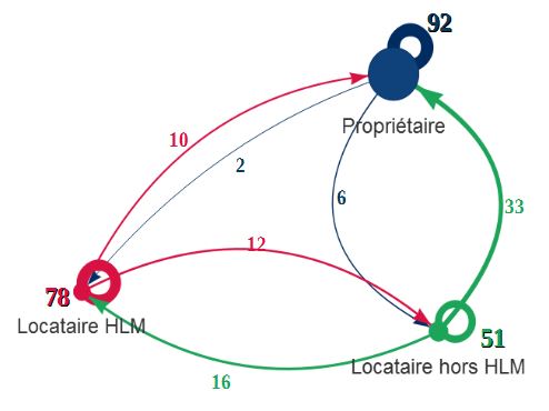 - Lecture : entre 2010 et 2015, sur 100 propriétaires, 92 le sont restés (bien qu'ils aient pu changer de résidence), 6 sont devenus locataires hors HLM et 2 locataires d'un logement HLM.