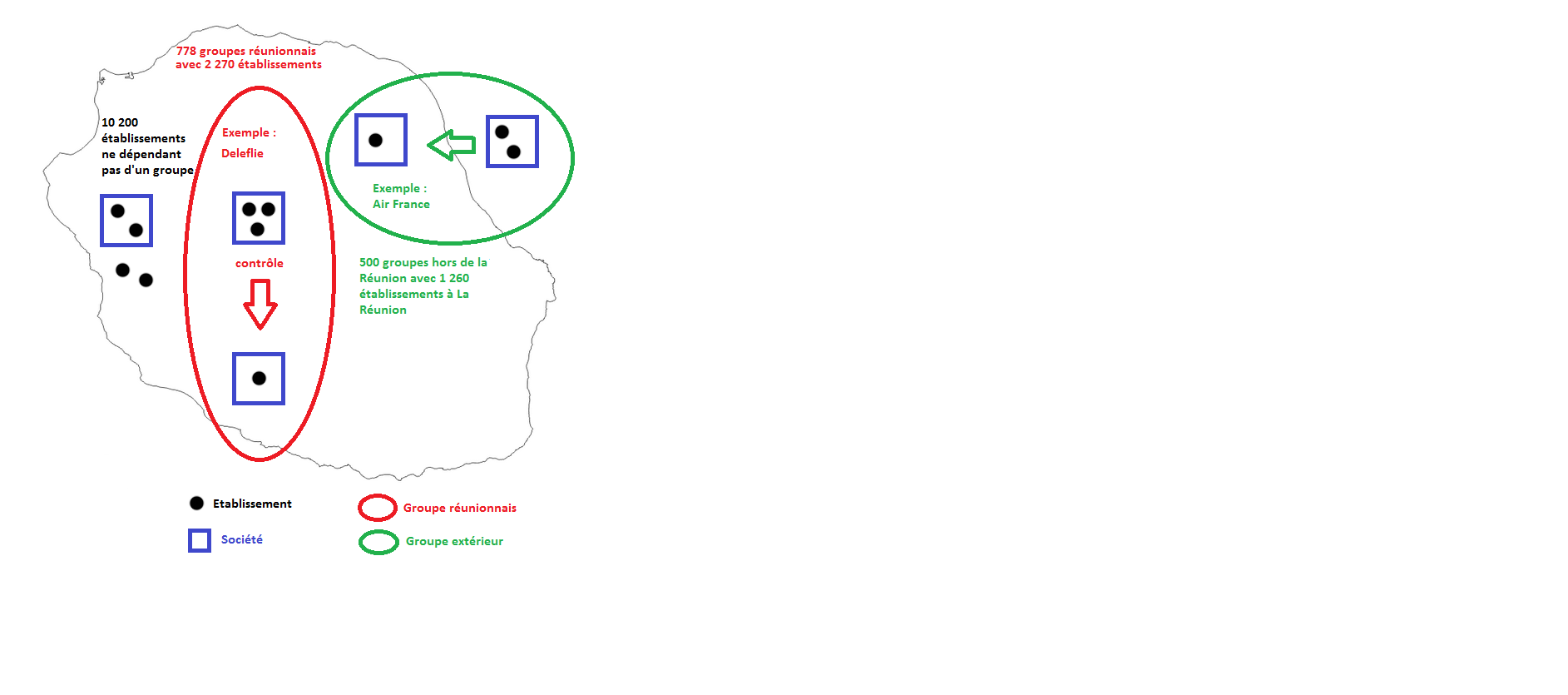 Les groupes ont un poids économique important dans les secteurs d’activité où sont implantés de grands groupes extérieurs multirégionaux voire internationaux : eau-énergie, information-communication, activités financières et d’assurance. Les groupes du secteur du commerce ont également une forte influence sur l’économie locale, ce qui n’est pas le cas de l’industrie. Si les groupes non réunionnais sont le plus souvent de grande taille, seuls 21 groupes dont le centre de décision est situé à La Réunion sur les 780 au total emploient plus de 250 salariés.