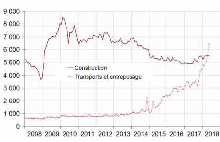 graphiqueGraphique3 – Créations mensuelles d'entreprises dans la construction et les transports - Données CVS-CJO*