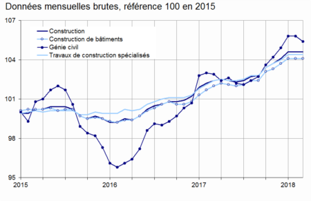 Au premier trimestre 2018, les coûts de production dans la construction ralentissent légèrement (+0,8 % après +1,1 % au trimestre précédent). Ils augmentent dans tous les sous-secteurs, mais à un rythme moindre qu'au trimestre précédent : +1,4 % (après +1,8 %) dans le génie civil, +0,7 % (après +1,0 %) dans la construction de bâtiments tout comme dans les travaux de construction spécialisés. Sur un an, les coûts de production dans la construction décélèrent également (+2,4 % après +2,7 % au quatrième trimestre 2017), aussi bien dans le génie civil (+2,7 % après +4,0 %) que dans les travaux de construction spécialisés (+2,3 % après +2,5 %) et dans la construction de bâtiments (+2,4 % après +2,7 %).