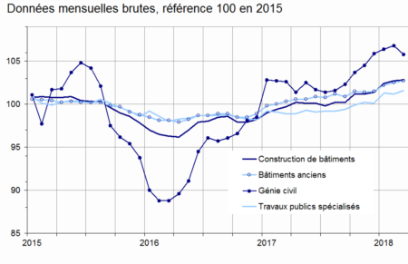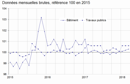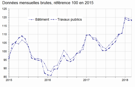 Au premier trimestre 2018, le coût du matériel augmente légèrement dans le bâtiment (+0,2 % après +0,1 %) mais recule de 0,2 % sur un an (après −0,8 %). Dans les travaux publics, il augmente aussi au premier trimestre (+0,3 % après +0,1 % au quatrième trimestre 2017) et il est stable sur un an (après +0,4 %).