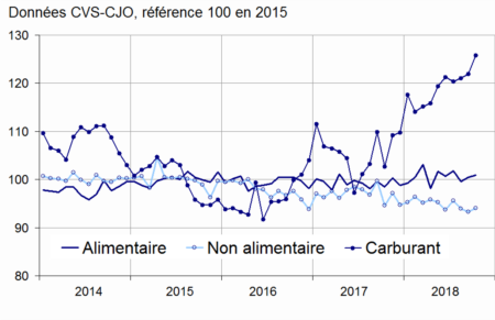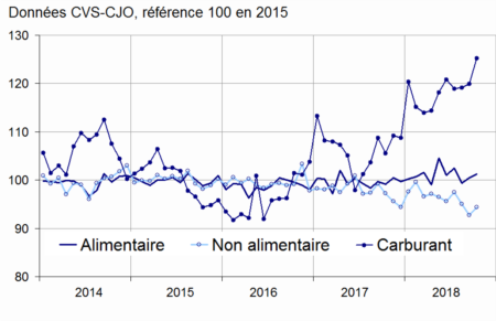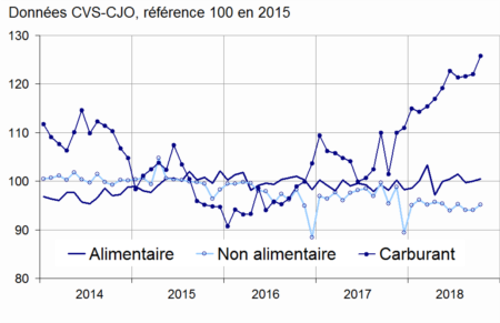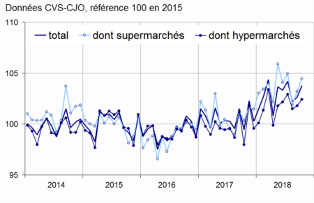 En octobre 2018, le chiffre d'affaires des grandes surfaces alimentaires poursuit sa hausse (+1,1 % après +0,4 % en septembre). En effet, les ventes augmentent de nouveau dans les produits alimentaires (+0,5 % après +0,8 %) ; celles des produits non alimentaires rebondissent (+0,8 % après −0,8 %) et celles de carburants accélèrent (+3,1 % après +0,8 %).