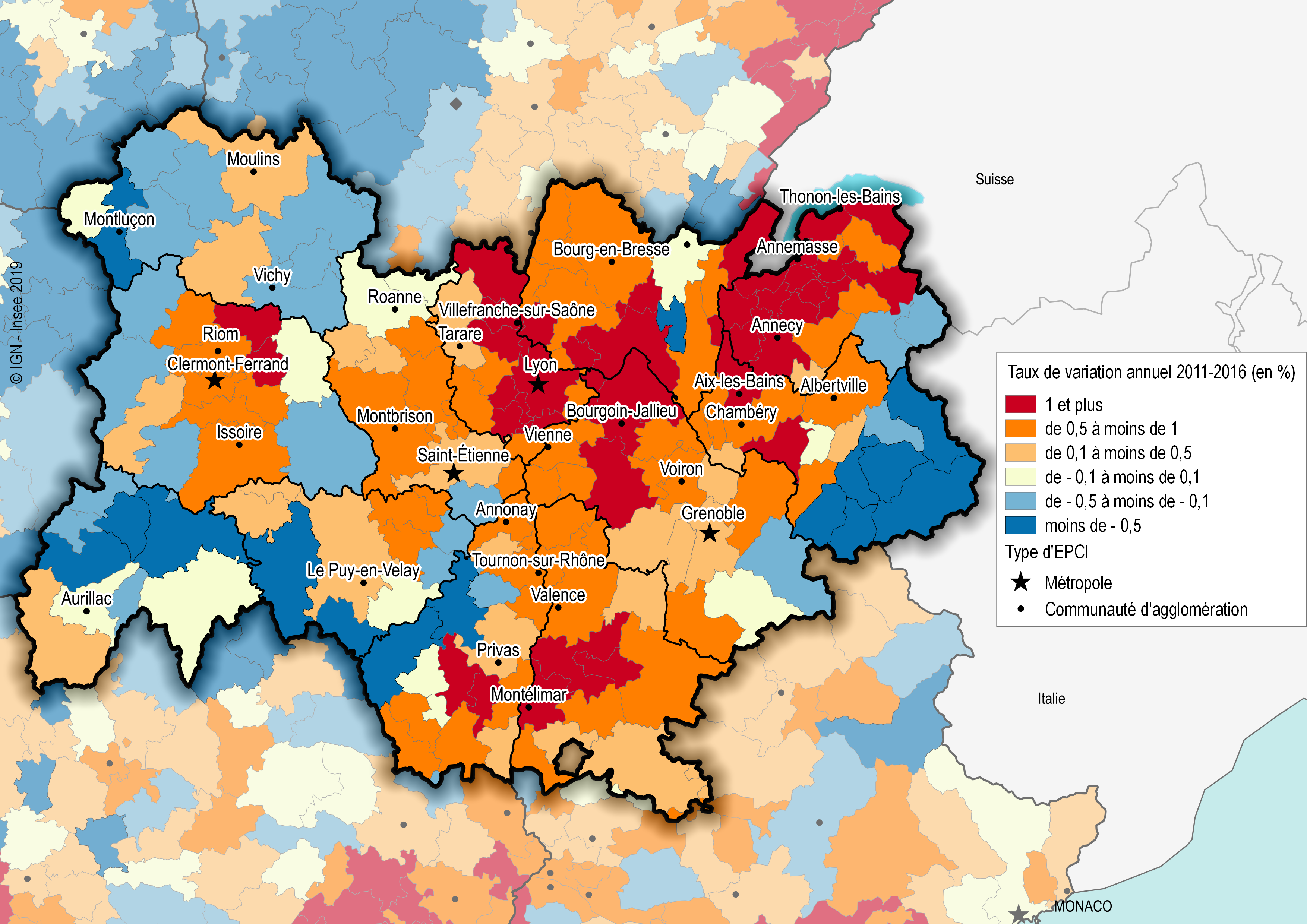 Au 1er janvier 2016, Auvergne-Rhône-Alpes compte 7,9 millions d’habitants. Entre 2011 et 2016, sa population augmente de 0,7 % par an en moyenne. Ce rythme, semblable à celui de la période 2006-2011, se distingue du niveau national où la croissance démographique ralentit. Il correspond à 560 000 habitants supplémentaires dans la région en dix ans, entre 2006 et 2016. À une échelle géographique plus fine, le dynamisme démographique de la région se retrouve dans la plupart des établissements publics de coopération intercommunale (Pour comprendre).