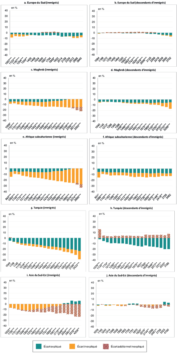 - Lecture : l’écart de taux d’inactivité entre les femmes descendantes maghrébines et celles sans ascendance migratoire est de 10 points. 4 points de cet écart proviennent de différences de caractéristiques observables (expérience sur le marché du travail, niveau de diplôme, lieu de résidence, situation familiale). Le reste de l’écart est inexpliqué.