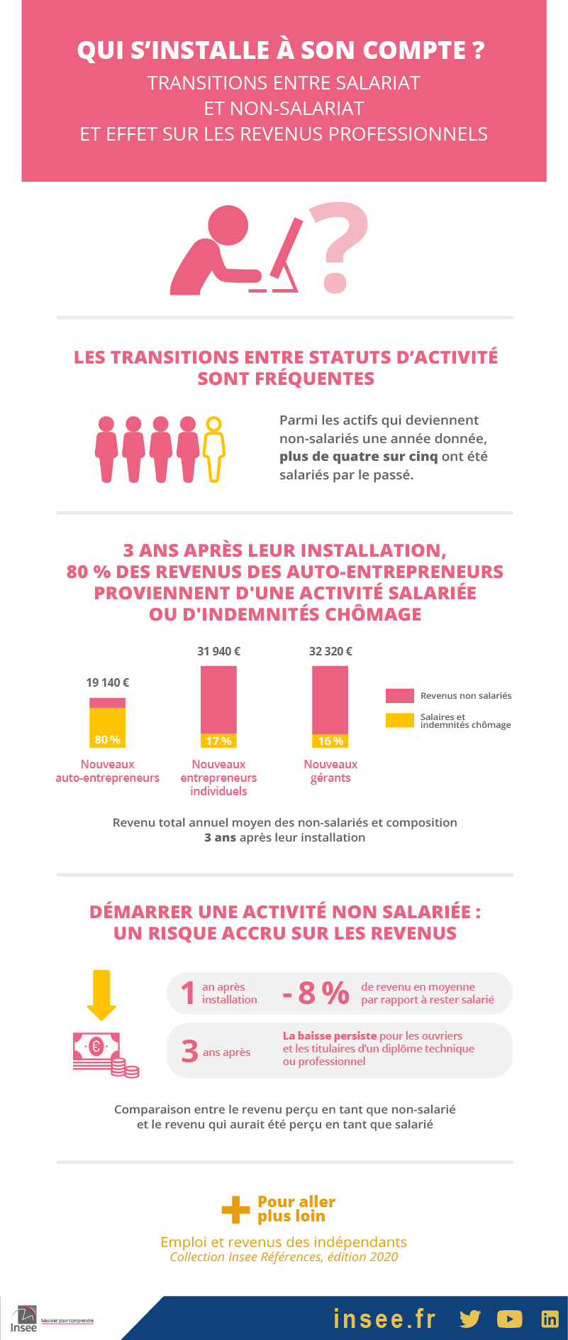 Les transitions entre statuts d’emploi sont fréquentes au cours d’une carrière. Ainsi, la majorité des individus âgés entre 20 et 60 ans qui deviennent non salariés une année donnée ont occupé un emploi salarié par le passé. Les salariés qui s’installent à leur compte sont plus jeunes et plus diplômés que la moyenne des salariés. Leur changement de statut peut être transitoire ou venir compléter leur activité salariée, comme c’est souvent le cas pour les auto-entrepreneurs. Trois ans plus tard, en moyenne, plus de la moitié des revenus professionnels des salariés ayant démarré une activité à leur compte provient du non-salariat.