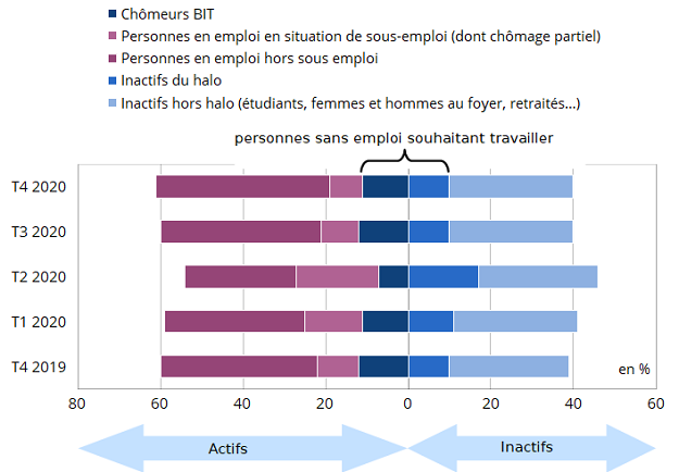 Avec le confinement au 2e trimestre, le chômage au sens du Bureau international du travail (BIT) a connu une baisse en trompe-l’œil. Principalement due aux difficultés à rechercher activement un emploi lorsque l’activité était à l’arrêt, cette baisse s’est traduite par une hausse du halo autour du chômage. Le taux de chômage est remonté ensuite, mais à la fin 2020 il reste au-dessous de son niveau d’avant-crise. Au final, la part des personnes sans emploi qui souhaitent travailler, qu’elles soient au chômage ou dans son halo, diminue en 2020.