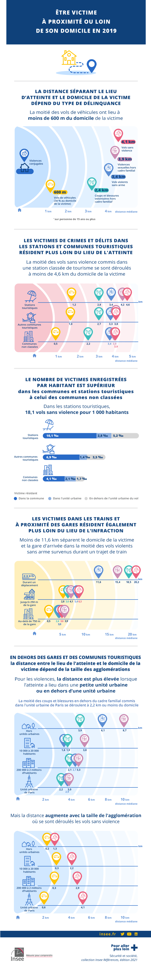 Ainsi, les vols de véhicule se produisent généralement à proximité du domicile des victimes, à moins de 600 m dans la moitié des cas, et les vols avec ou sans violence dans des lieux plus éloignés, respectivement à plus de 3,4 et 4,1 km dans la moitié des cas ; 40 % des violences intrafamiliales ne sont pas commises au sein du domicile de la victime.