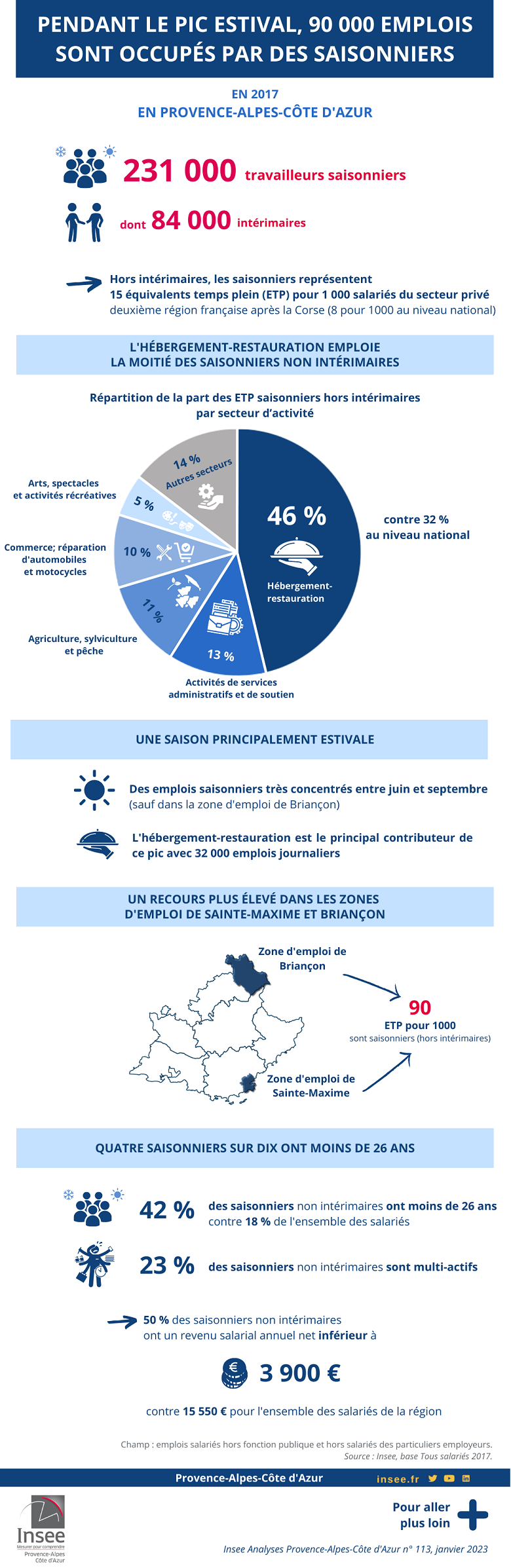 (1) « Ouvrir dans un nouvel ongletPendant le pic estival, 90 000 emplois occupés par des saisonniers », fiches territoriales, janvier 2023.