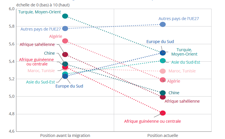 - Note : la question posée était « Il y a des gens qui sont plutôt en haut de notre société et d'autres plutôt en bas. Actuellement, où vous placeriez-vous sur cette échelle (0 étant le plus bas, et 10 le plus haut) ? Et dans votre pays de naissance, avant d’arriver en France métropolitaine ? ».