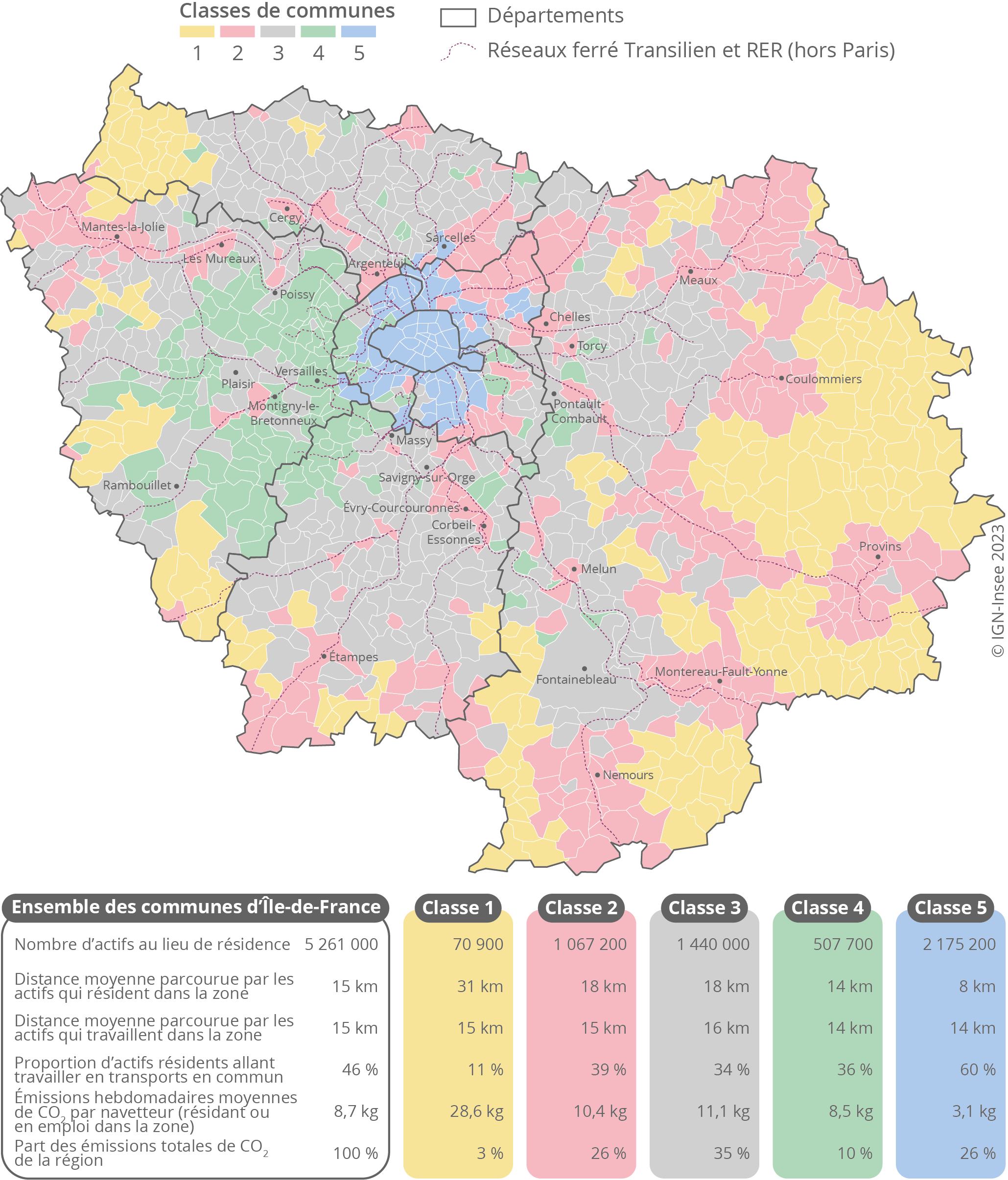 Enfin, la dernière classe comprend 56 communes de petite couronne et 4 communes de grande couronne qui sont limitrophes de la petite couronne (Vélizy-Villacoublay, Viroflay, Deuil-la-Barre et Sarcelles), ainsi que tous les arrondissements de Paris. Ces territoires sont très bien desservis par les transports en commun (métro, tramway, RER, Transilien), qui sont très majoritairement utilisés. Cette classe regroupe 56 % des emplois franciliens, parmi lesquels beaucoup relèvent de fonctions de cadre. En moyenne, les navetteurs parcourent des distances très courtes (8 km) et émettent peu de GES (3,1 kg par semaine). Toutefois, composée de communes fortement peuplées, cette classe représente un quart des émissions de CO2 de la région.