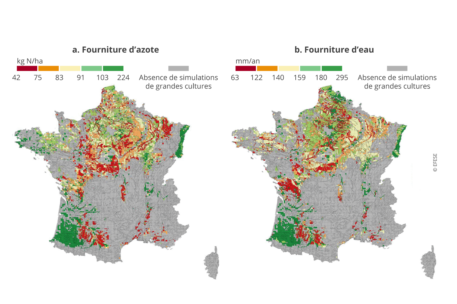 - Notes : Quantité moyenne d’azote minéral fourni par l’écosystème pour des systèmes de culture conduits avec les pratiques agricoles observées (figure a). Stockage et restitution de l’eau aux plantes cultivées (transpiration annuelle moyenne des cultures). Simulations réalisées considérant des cultures sans irrigation, y compris dans les zones où elles sont classiquement irriguées (figure b). Les cartes sont extraites de [Ouvrir dans un nouvel ongletTibi, Therond, 2017].