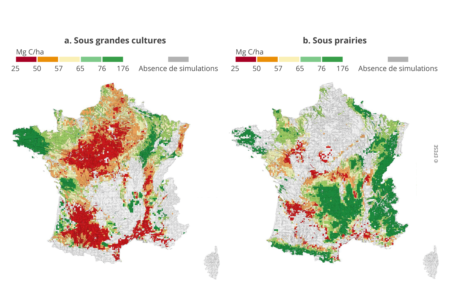 - Notes : Stock de carbone du sol sur l’horizon 0-0,3 m, en Mg (ou tonnes) C par ha sous grandes cultures pour les systèmes de cultures « actuels » (figure a) et sous prairies (prairies permanentes et prairies temporaires de plus de 3 ans) pour les systèmes de prairies « actuels » (figure b). Les cartes sont extraites de [Ouvrir dans un nouvel ongletTibi, Therond, 2017].