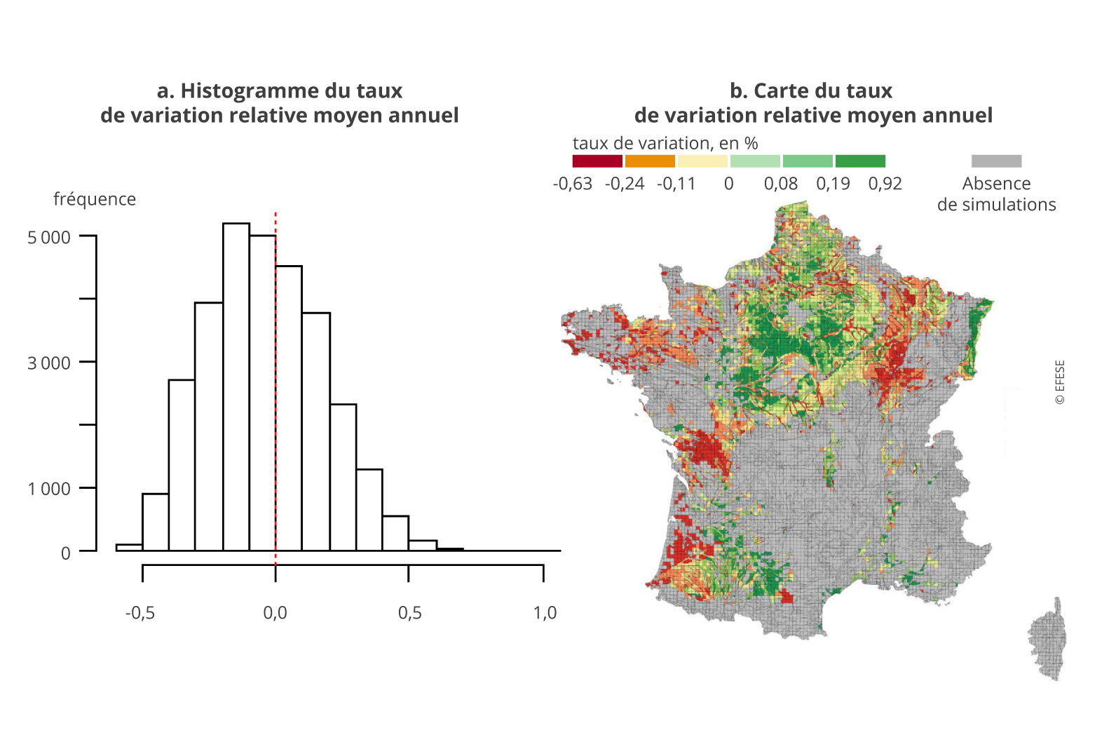- Notes : Taux de variation relatif moyen annuel (en %) du stock de carbone sur l’horizon 0-0,3 m sous grande culture. Histogramme pour les 30 580 systèmes de grande culture simulés sur 30 ans avec STICS (figure a). Les valeurs négatives ont été équiréparties en trois classes et les valeurs positives en trois classes, de sorte à borner l’une des classes sur 0 (figure b). La carte est extraite de [Ouvrir dans un nouvel ongletTibi, Therond, 2017].
