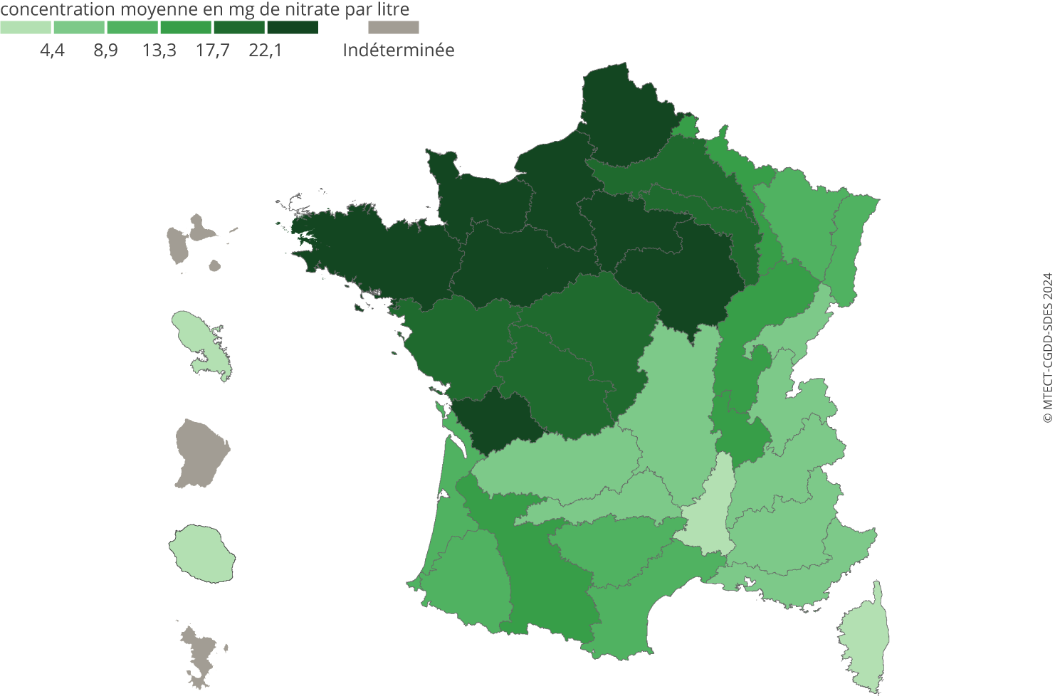 Une partie des effluents agricoles, des engrais et des pesticides rejoint les cours d’eau, les lacs et les nappes phréatiques par ruissellement ou infiltration. La concentration moyenne en nitrate des cours d’eau de France métropolitaine est en hausse de 6 % entre 2000 et 2020. Elle varie fortement selon les territoires, les concentrations les plus élevées étant observées en Bretagne, Normandie, Île‑de‑France et Hauts‑de‑France (figure 4). Ces territoires cumulent parfois différents facteurs, comme la présence de gros cheptels, des terres agricoles avec de forts excédents d’azote, ou des superficies enherbées en baisse.
