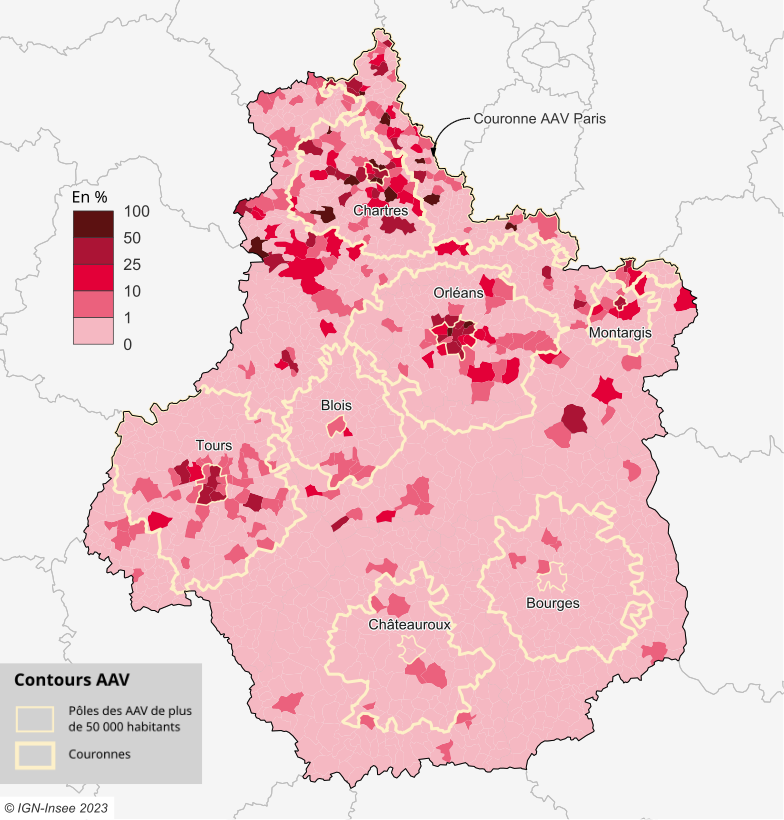 L’aire d’attraction des villes définit l’étendue de l’influence d’une ville sur les communes environnantes. Une aire est un ensemble de communes, d’un seul tenant et sans enclave, constitué d’un pôle de population et d’emploi, et d’une couronne qui regroupe les communes dont au moins 15 % des actifs travaillent dans le pôle.