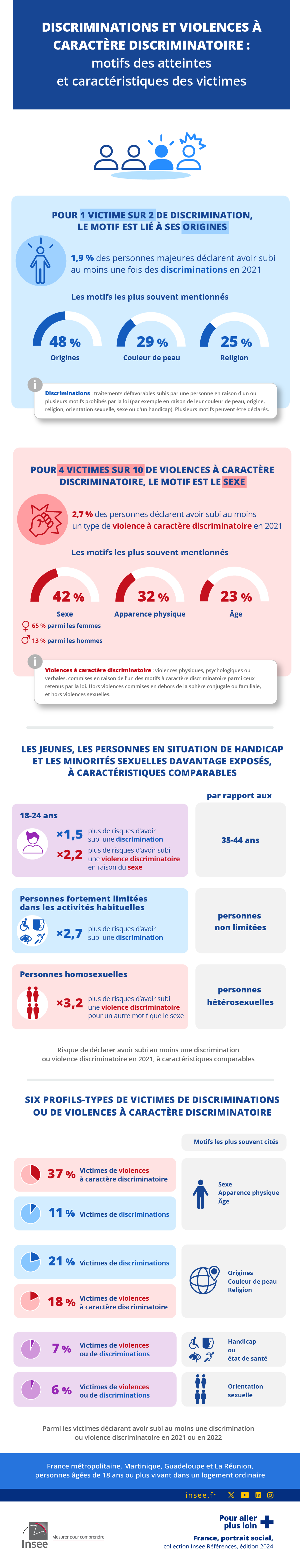 En 2021, 6,7 % des personnes âgées de 18 ans ou plus vivant en France métropolitaine, Martinique, Guadeloupe ou à La Réunion déclarent avoir subi au moins une violence physique, verbale ou psychologique, à caractère non sexuel, en dehors de la sphère conjugale ou familiale (méthodes). 2,7 % de la population (3,0 % des femmes et 2,2 % des hommes), soit 40 % des victimes de violences, invoquent un motif discriminatoire. Les violences sexuelles, par nature toujours en lien avec le sexe de la victime, sont exclues de l’analyse.