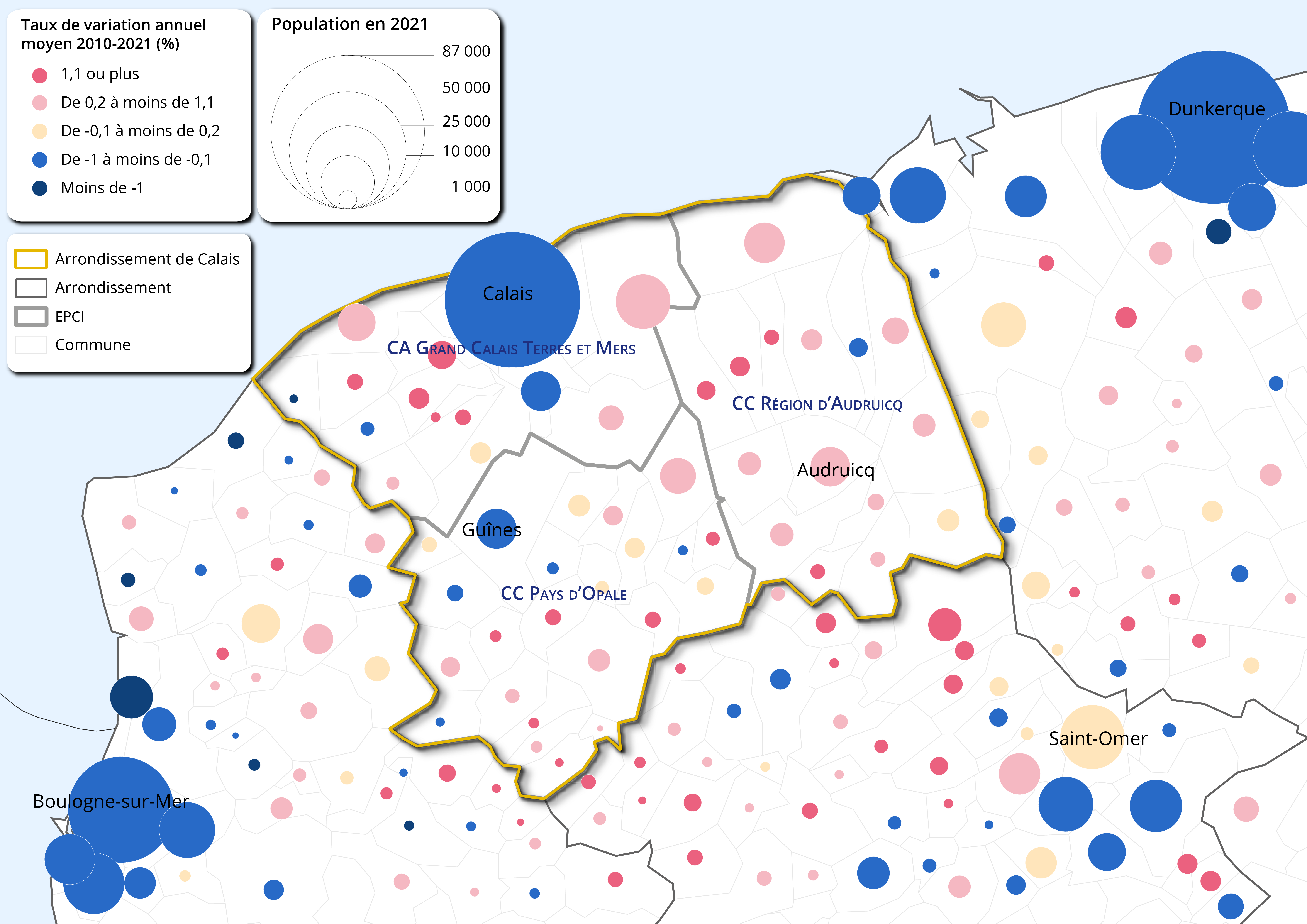 Entre 2010 et 2021, l’arrondissement de Calais perd 1,2 % de sa population (-0,1 % en moyenne par an), alors que la population régionale progresse de +0,7 % (+0,1 % par an en moyenne).