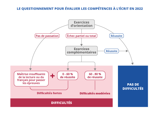 | Maîtrise insuffisante de la lecture ou du français pour passer les épreuves | 0 – 60 % de réussite | 60-80 % de réussite | Pas de difficultés |