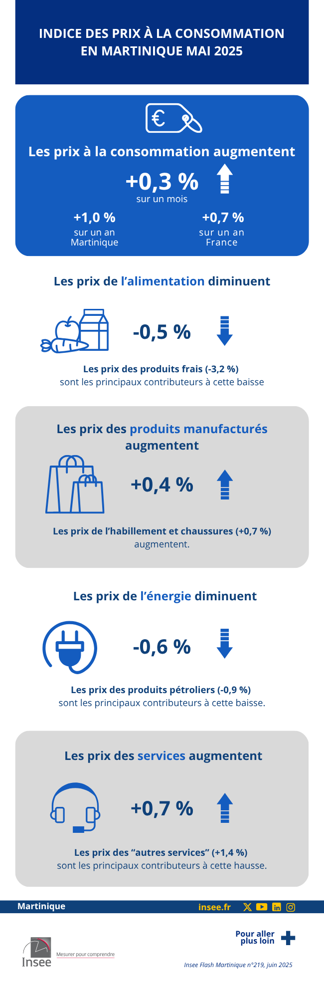 En mai 2025, les prix à la consommation augmentent de 0,3 % en Martinique, après -0,3 % en avril. Les prix des services (+0,7 %) et des produits manufacturés (+0,4 %) sont en hausse, contrairement à ceux de l’énergie (-0,6 %) et de l’alimentation (-0,5 %). Sur les douze derniers mois, les prix augmentent de 1,0 % en Martinique et de 0,7 % pour l’ensemble de la France.
