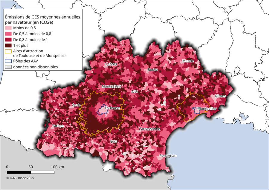 En 2021, les 2,2 millions d’habitants qui se déplacent pour aller au travail émettent chacun en moyenne 0,66 tCO2e par an en Occitanie, soit un tiers de l’objectif national d’émettre 2 tCO2e par an et par personne à l'horizon 2050. La région est la quatrième de France de province où les navetteurs émettent le moins de gaz à effet de serre grâce à des distances domicile-travail plus courtes. Mais le recours à la voiture reste très majoritaire et un peu plus fréquent dans la région qu’en France de province.