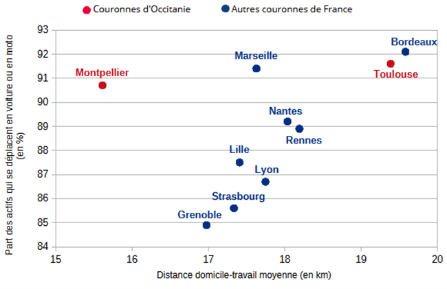 En 2021 en Occitanie, la moitié des navetteurs (52 %) vivent au sein des couronnes des AAV. Ils génèrent 65 % des émissions de GES des trajets domicile-travail dans la région. Les émissions par navetteur y sont importantes (0,82 tCO2e par navetteur et par an). Elles sont particulièrement élevées dans les communes des AAV de Toulouse et de Montpellier les plus éloignées des pôles (figure 3). Parmi les couronnes des dix plus grandes aires d’attraction des villes, celle de Toulouse occupe la deuxième place derrière Bordeaux pour les émissions élevées de GES par actif résident (0,87 tCO2e) . Des distances moyennes plus longues (19,4 km) et une utilisation plus fréquente de la voiture ou de la moto (91,6 %) (figure 4) expliquent ces émissions plus conséquentes. Les distances parcourues par les actifs de la couronne de Montpellier sont plus courtes (15,6 km en moyenne) mais le taux d’utilisation de la voiture ou de la moto est élevé (90 %). Parmi les dix plus grandes aires d'attraction des villes, la couronne de Montpellier se classe neuvième plus émettrice en termes d'émissions de GES grâce à ces trajets plus courts.